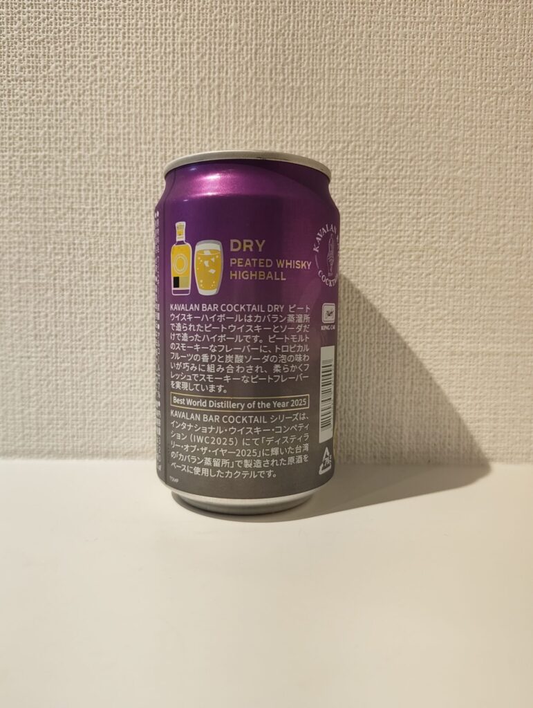 缶情報輸入者:日本酒類販売株式会社種類:台湾ウイスキー蒸留所:カバラン缶写真缶表面に記載している内容を転記します。「KAVALAN BAR COCKTAIL DRY シングルモルトハイボールはカバラン・クラシック・シングルモルト・ウイスキー...